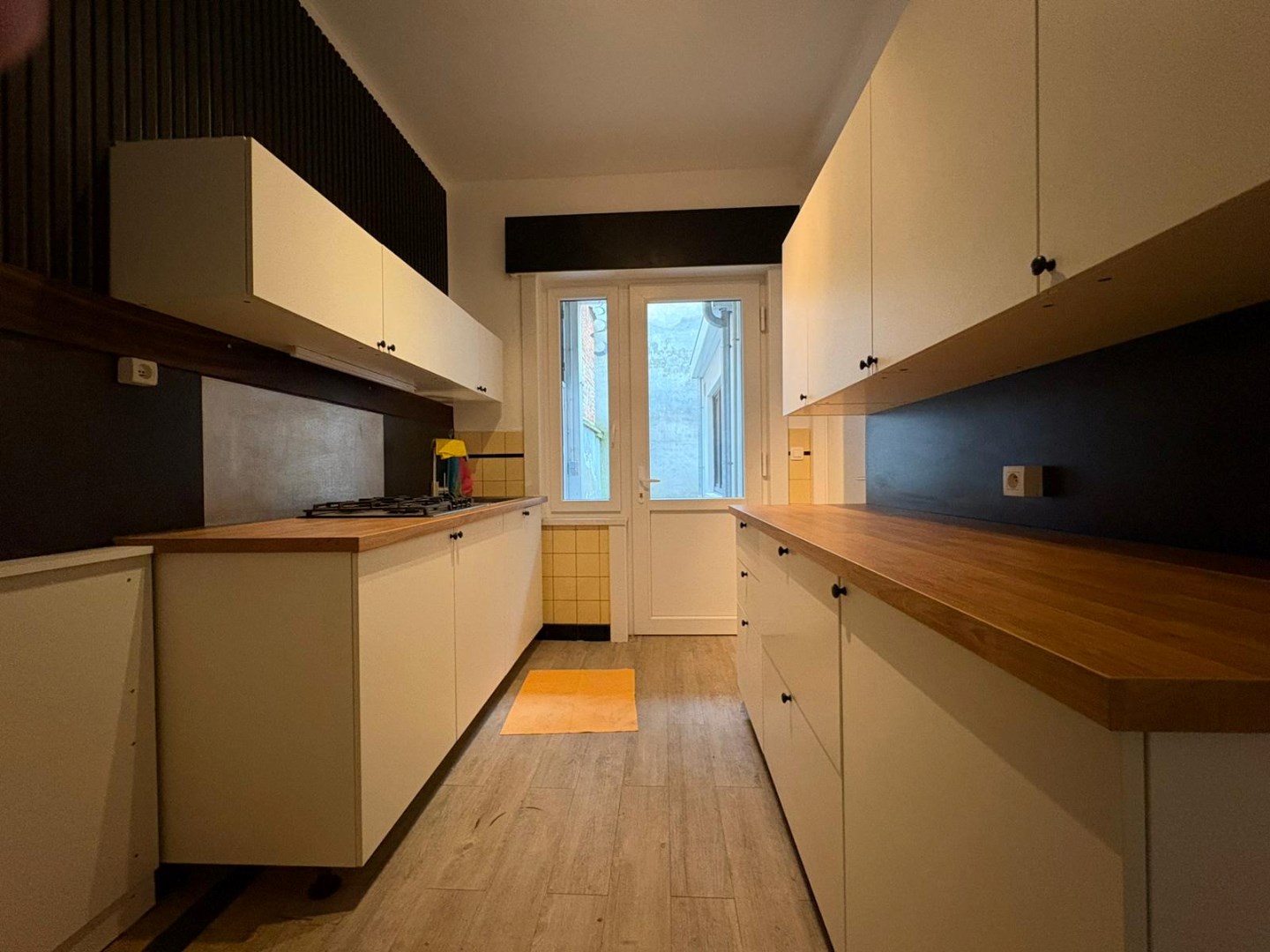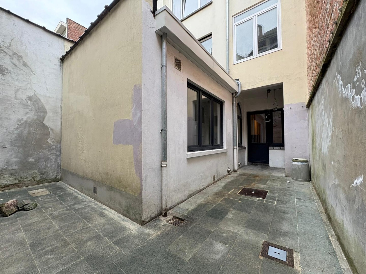 Een GLVL-appartement met buitenkoer, er bestaande uit winkelruimte, inkomhall met bergkast / vestiaire, douchekamer, toilet, ingerichte keuken met toegang naar koer, eetplaats, 1 ruime slpk., koer - kelderberging - gescheiden meters zijn voorzien.