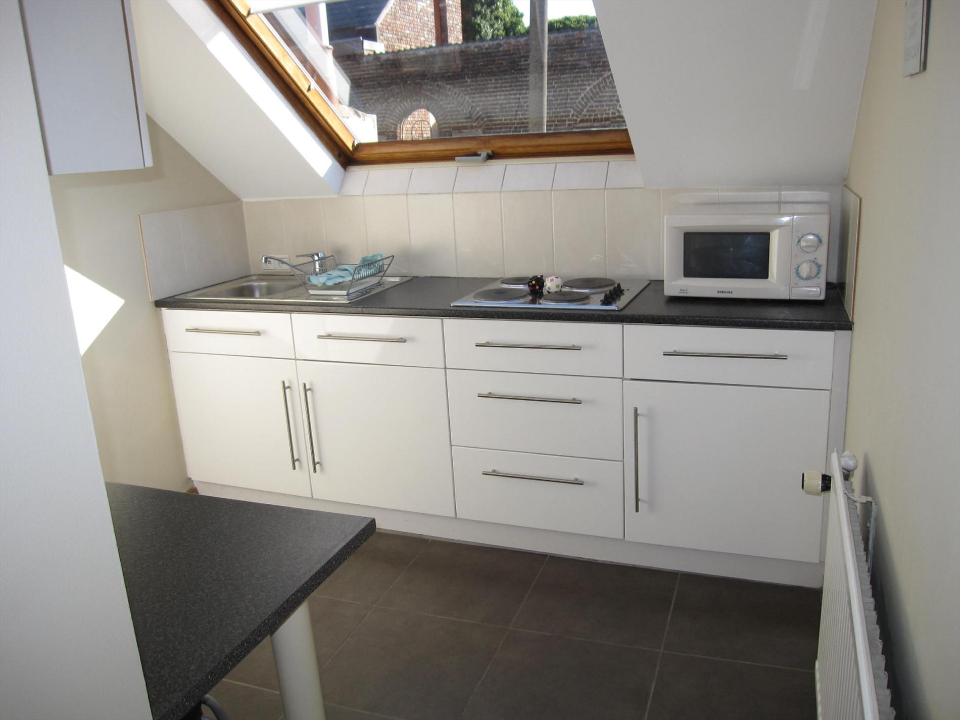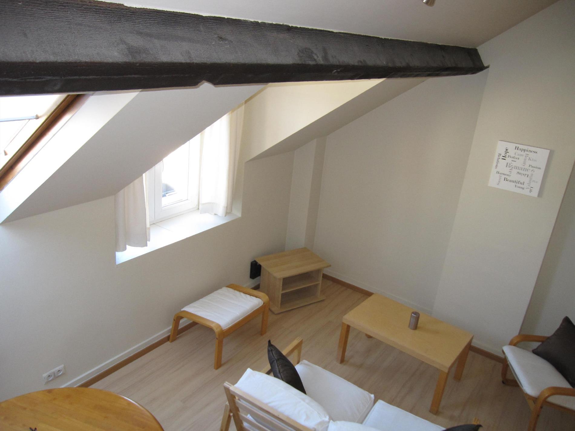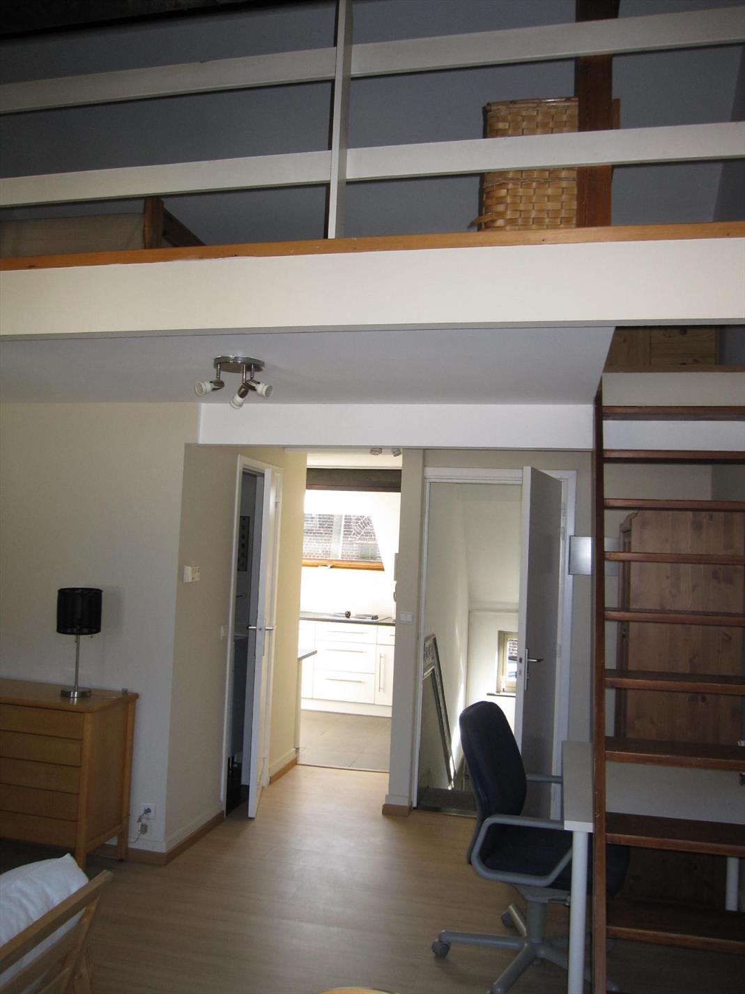 Knus gemeubelde duplex-studio op VERD. 2 van een kleinschalige residentie, gelegen in centrum van Zaventem en nabij alle winkels en openbaar vervoer. - appartement op VERD. 2 bestaande uit gemeenschappekijke inkomhall - eetplaats/leefruimte, open keuken, toilet, 1 slpk. op mezanine, ruime badkamer, kelderberging