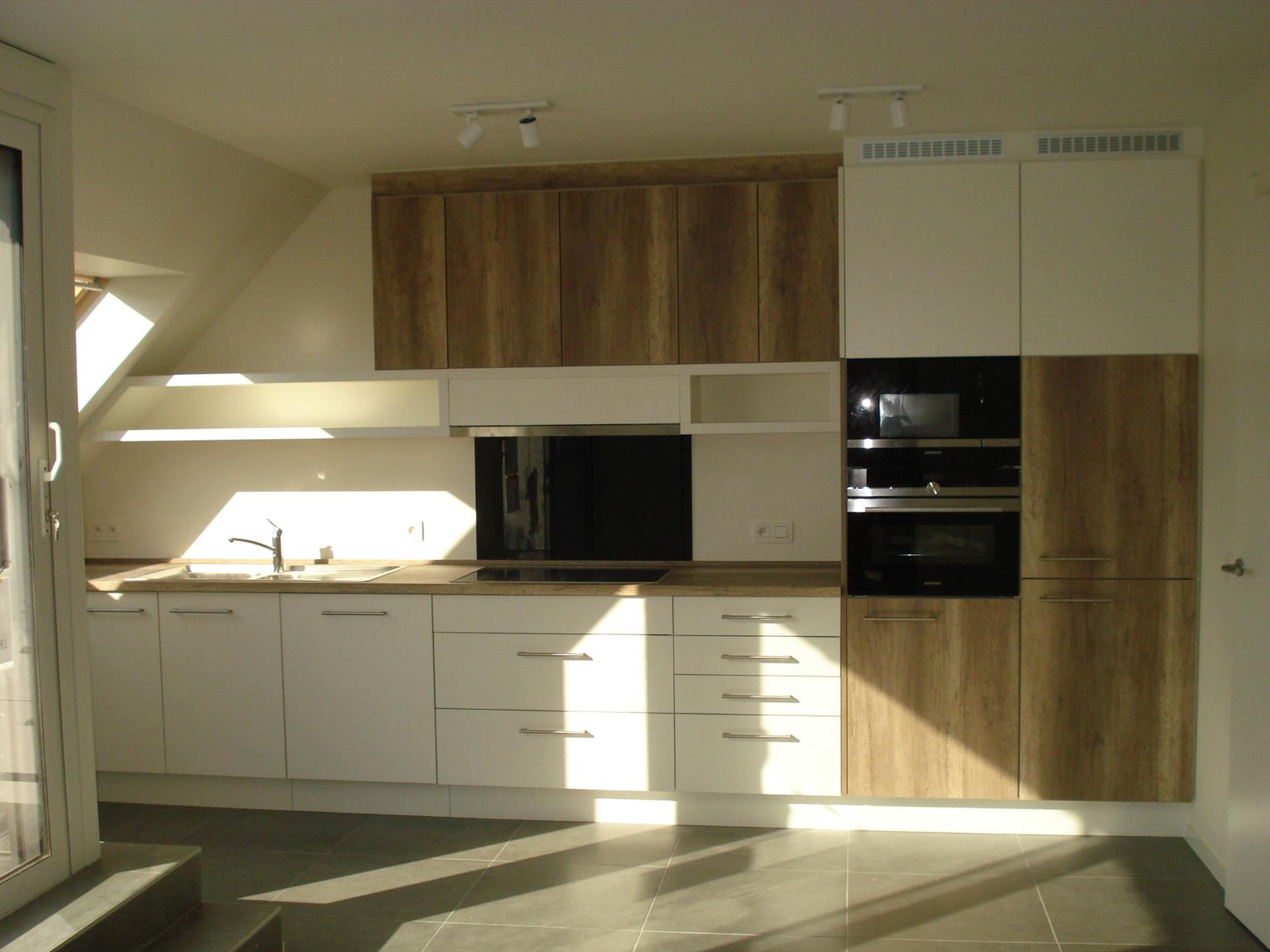 Recent nieuwbouw duplex-appartement op VERD. 2 in een residentie met lift en er omvattende een eetplaats (directe toegang naar terras) met ingerichte open keuken, leefruimte, toilet, hall, berging, bureau - DAKNIV. met douchekamer, 1 slpk. met dressingwand, bergruimte, toilet, traphall - op het GLVL. niv. is er een overdekte autostaanplaats met aanpalende berging voorzien op een beveiligde parking. Het appartement wordt volledig geschilderd afgeleverd en is voorzien van lichtarmaturen.