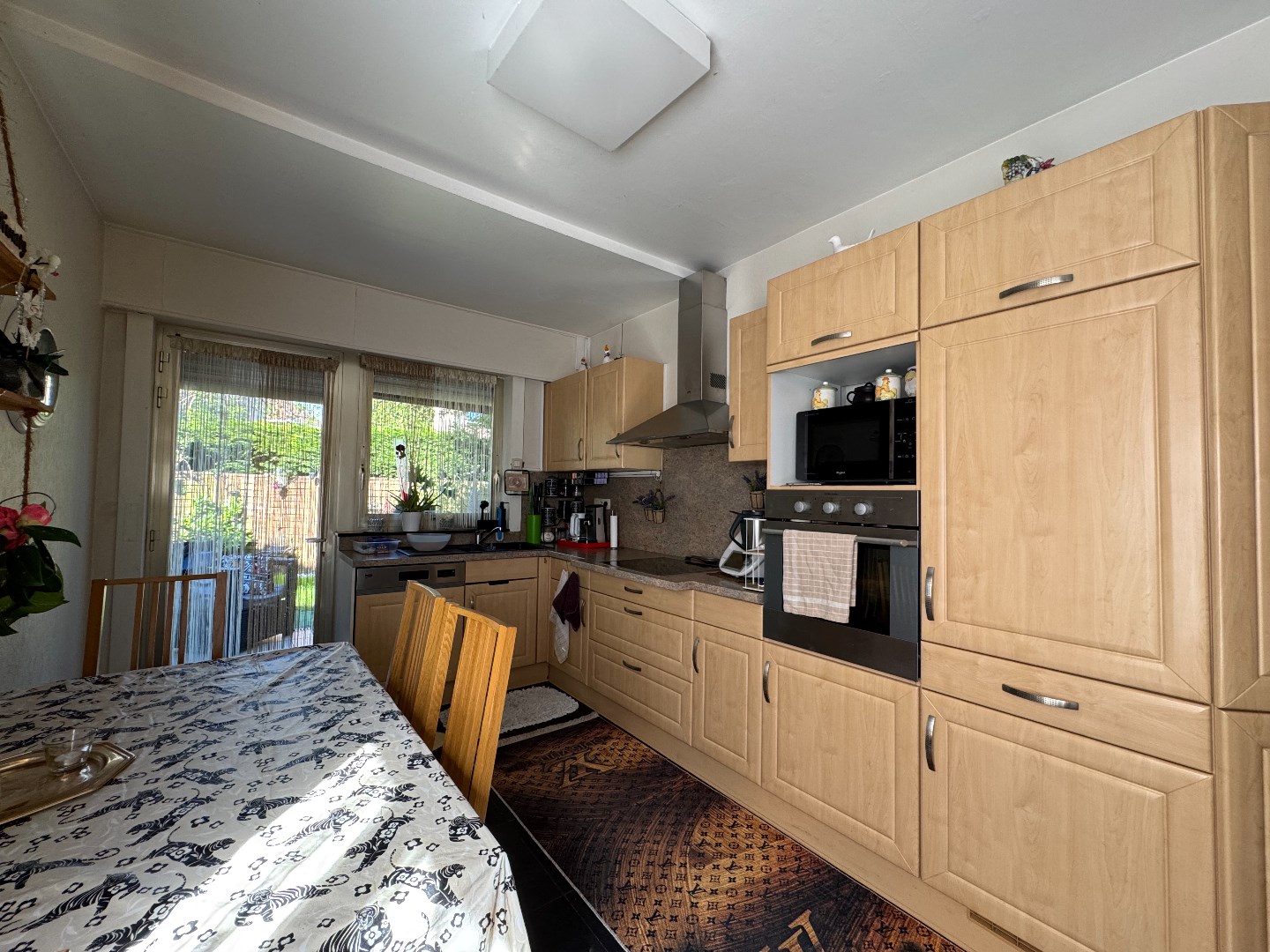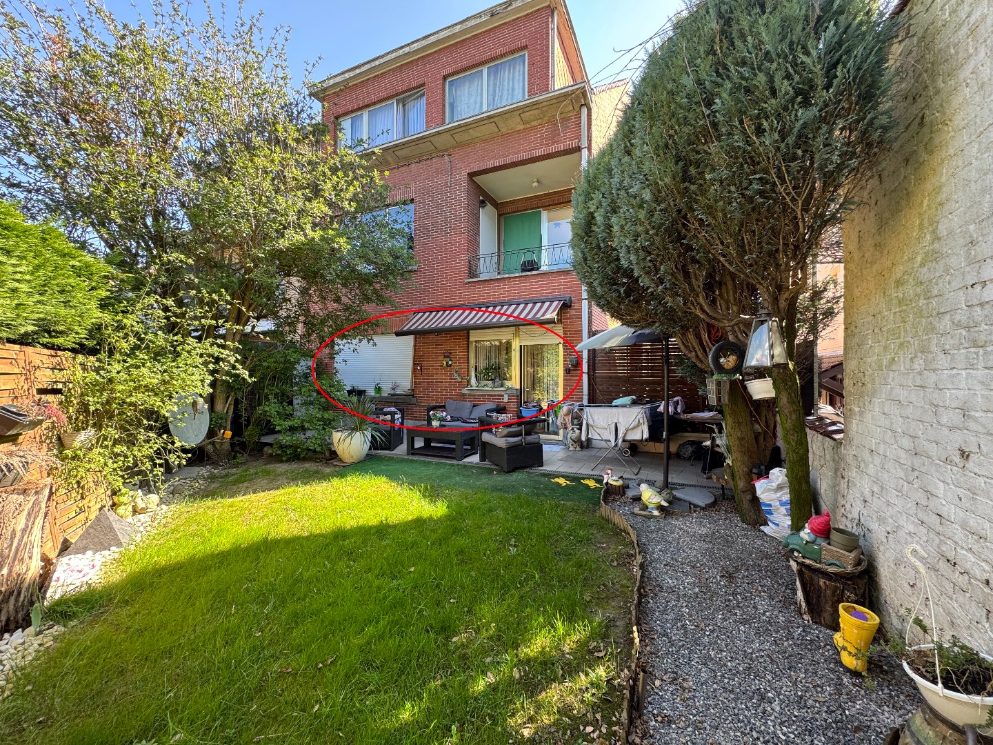 een lichtrijk appartement gesitueerd op VERD. 1 er omvattende een inkomhall, leefruimte-eetplaats in L-vorm, buro, ingerichte keuken uitgevend op tuin, 1 kamer, een sas aansluitend op het toilet en de badkamer - kelder n°. 1 - 4 - 5 en garage n°. 1 zijn voorzien op het GLVL. niv.